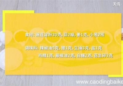 步骤1【凉粉的制作方法 凉粉怎么做】食材:豌豆淀粉30克,蒜2瓣,姜1克,小葱2根、辣椒油5克,醋1克,生抽3克,盐1克,鸡精1克,藤椒油2克,白糖2克,花生碎3克 。步骤2蒜切末 。步骤3姜切末 。步骤4小葱切葱花 。步骤5豌豆淀粉加60...