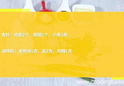 步骤1准备食材:鸡蛋2个、甜椒1个、小葱2根、食用油5克、盐2克、鸡精1克 。步骤2鸡蛋打散,加少许盐,搅匀 。步骤3甜椒洗净,切小块 。步骤4小葱切葱花 。步骤5热锅倒油,油温7成热时,倒入鸡蛋液,炒散,捞出备用 。步骤6锅中留底油,倒入...
