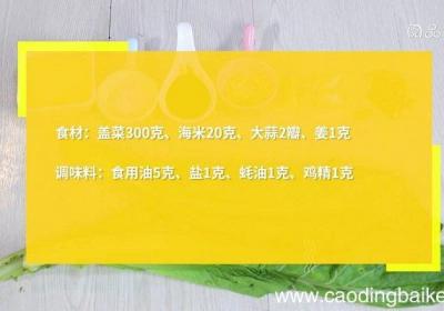 步骤1食材:盖菜300克、海米20克、大蒜2瓣、姜1克 。调味料:食用油5克、盐1克、蚝油1克、鸡精1克 。步骤2盖菜洗净、切小段,大蒜切末,姜切末 。步骤3热锅倒油,油温5成热时,下入蒜、姜、海米,炒香 。步骤4放入盖菜,翻炒1分钟,调入...