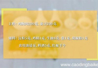 步骤1主料:鸡胸肉200克、蚕豆200克 。辅料:红椒半个、盐1克、鸡精1克、生抽8克、料酒5克、胡椒粉1克、淀粉5克、食用油适量 。步骤2鸡胸肉洗净切丁 。步骤3放入胡椒粉1克、生抽5克、料酒5克,再放入淀粉5克拌匀腌制10分钟 。步骤4...