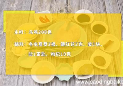 步骤1准备食材:乌鸡200克、冬虫夏草2根、藏红花2克、姜1块、盐1茶匙、枸杞10克 。步骤2乌鸡洗净剁块 。步骤3姜切片 。步骤4枸杞浸泡10分钟 。步骤5首先起锅烧水,水开放入乌鸡,大火煮至沸腾,撇去浮沫,捞出 。步骤6砂锅中加入姜片、...