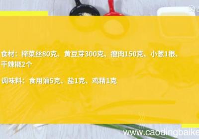 步骤1准备食材:榨菜丝80克、黄豆芽300克、瘦肉150克、小葱1根、干辣椒2个、食用油5克、盐1克、鸡精1克 。【榨菜黄豆芽炒肉丁的做法,榨菜黄豆芽炒肉丁怎么做】步骤2黄豆芽洗净 。步骤3瘦肉切丁 。步骤4小葱切葱花 。步骤5干辣椒切小段...