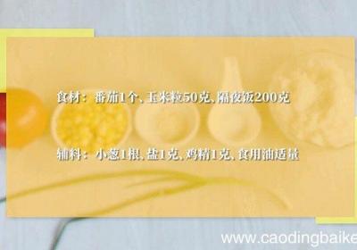 步骤1准备食材:番茄1个、玉米粒50克、隔夜饭200克 。辅料:小葱1根、盐1克、鸡精1克、食用油适量 。步骤2番茄洗净切成小?。星写谢?。步骤3锅中放入适量油,油温烧至6成热,放入玉米粒翻炒30秒 。步骤4放入番茄丁炒至出汁 。【番茄玉...