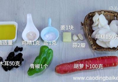 步骤1准备食材:年糕150克,油适量,木耳50克,青椒1个,姜1块,蒜2瓣,胡萝卜100克,鸡精1克,盐1克 。步骤2胡萝卜去皮洗净切片 。步骤3青椒洗净去籽切块 。步骤4姜切末 。步骤5蒜切末 。步骤6锅中倒入适量清水大火烧开,放入年糕、...