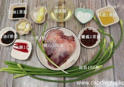 步骤1准备食材:猪心200克、蒜苔100克、小葱1根、姜1块、蒜3瓣、油适量、盐1茶匙、豆瓣酱1茶匙、耗油1茶匙、生抽1茶匙、料酒1茶匙,小米辣10克步骤2猪心洗净切片 。步骤3蒜苔切段 。步骤4小葱切葱花 。步骤5姜切丝 。步骤6蒜切片...