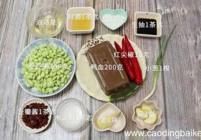 步骤1准备食材:鸭血200克、毛豆米100克、红尖椒10克、油适量、料酒1茶匙、盐1茶匙、生抽1茶匙、豆瓣酱1茶匙、水淀粉1茶匙、姜1块、蒜3瓣、小葱1根 。步骤2鸭血洗净切小块 。步骤3毛豆米洗净 。步骤4红辣椒切片 。步骤5姜切丝 。步...
