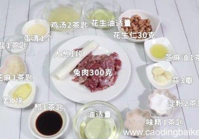 步骤1准备食材:兔肉300克,花生仁30克,蛋清1个、盐1茶匙、味精1茶匙、淀粉2茶匙、蒜3瓣、醋1茶匙、芝麻油1茶匙、大葱1段、姜1块、芝麻1茶匙、鸡汤2茶匙、花生油适量 。步骤2姜切片 。步骤3蒜切片 。步骤4葱切片 。步骤5花生仁用温...