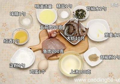 步骤1准备食材:大虾10只、鱼肉200克、五花肉50克、鸡蛋1个、淀粉2勺、葱姜水20克、上汤100克、花椒水2勺、精盐1勺、味精1勺、胡椒粉1勺、绍酒1勺、明油适量 。步骤2大虾去须,挑除沙包、沙线 。步骤3洗净后从脊部切开4厘米的长口...