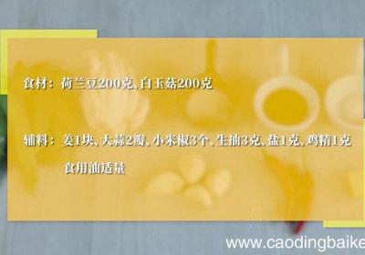 步骤1食材:荷兰豆200克、白玉菇200克 。辅料:姜1块、大蒜2瓣、小米椒3个、生抽3克、盐1克、鸡精1克、食用油适量 。步骤2【荷兰豆炒白玉菇的做法 荷兰豆炒白玉菇怎么做】荷兰豆摘洗干净 。步骤3白玉菇去蒂备用 。步骤4姜切末,蒜切末,...