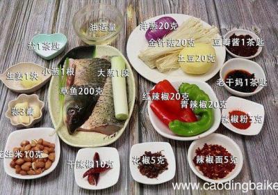 步骤1准备食材:草鱼200克、油适量、盐1茶匙、生姜1块、蒜3瓣、土豆20克、洋葱20克、大葱1段、金针菇20克、花生米10克、青辣椒20克、红辣椒20克、干辣椒10克、花椒5克、辣椒面5克、辣椒粉5克、豆瓣酱1茶匙、老干妈1茶匙、小葱1根...