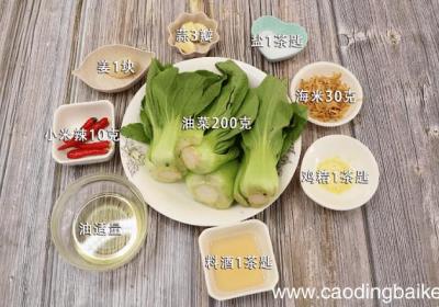 步骤1准备食材: 油菜200克、海米30克、小米辣10克、姜1块、蒜3瓣、盐1茶匙、鸡精1茶匙、油适量、料酒1茶匙 。步骤2油菜洗净,掰成片 。步骤3小米辣切圈 。步骤4海米侵泡10分钟备用 。步骤5姜切片 。步骤6蒜切片 。步骤7首先起锅...