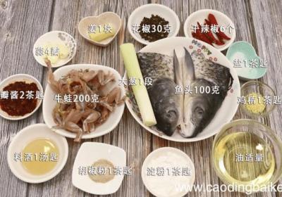 步骤1准备食材:牛蛙200克、鱼头100克、姜1块、蒜4瓣、大葱1段、花椒30克、干辣椒6个、盐1茶匙、鸡精1茶匙、豆瓣酱2茶匙、料酒1汤匙、胡椒粉1茶匙、淀粉1茶匙、油适量 。步骤2姜切片 。步骤3蒜切片 。步骤4大葱切片 。步骤5干辣椒...
