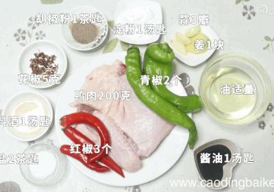 步骤1准备食材:鸭肉200克、青椒2个、红椒3个、淀粉1汤匙、酱油1汤匙、盐2茶匙、料酒1汤匙、胡椒粉1茶匙、蒜3瓣、姜1块、花椒5克、油适量 。步骤2姜切片 。步骤3蒜切片 。步骤4青椒切块 。步骤5红椒切块 。步骤6鸭肉剁成块 。步骤7...