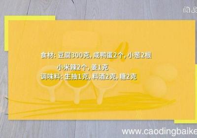 【咸鸭蛋蒸豆腐的做法 咸鸭蛋蒸豆腐怎么做】步骤1食材:豆腐300克,咸鸭蛋2个,小葱2根,小米辣2个,姜1克 。调味料:生抽1克,料酒2克,糖2克 。步骤2豆腐切片,铺入碗中 。步骤3咸鸭蛋取出蛋黄,压碎,放入豆腐中 。步骤4小葱切段 。步...