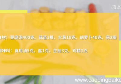 步骤1准备食材:豆腐泡400克、蒜苗1根、大葱10克、胡萝卜40克、蒜2瓣、食用油5克、盐1克、生抽3克、鸡精1克 。步骤2豆腐泡洗净、对半切开 。步骤3大葱切片 。步骤4胡萝卜切片 。【红烧豆腐泡做法红烧豆腐泡怎么做】步骤5蒜苗切片、蒜切...