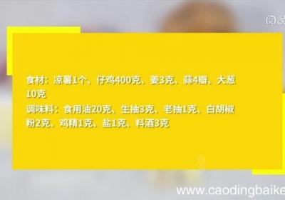 步骤1食材:凉薯1个,仔鸡400克,姜3克,蒜4瓣,大葱10克 。调味料:食用油20克,生抽3克,老抽1克,白胡椒粉2克,鸡精1克,盐1克,料酒3克 。【凉薯炒鸡块做法,凉薯炒鸡块】步骤2仔鸡剁小块 。步骤3凉薯去皮,切片 。姜切片,蒜切片...