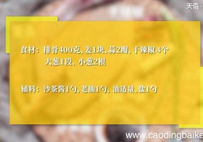 步骤1食材: 排骨400克、姜1块、蒜2瓣、干辣椒4个、大葱1段、小葱2根 。辅料: 沙茶酱1勺、老抽1勺、 油适量、盐1勺 。步骤2排骨洗净切块,加入清水去除杂质 。步骤3姜切末 。步骤4蒜切末 。步骤5干辣椒切小段 。步骤6小葱切小段...