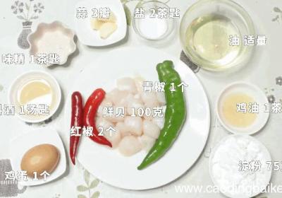 步骤1准备食材:鲜贝100克、鸡蛋1个、淀粉75克、青椒1个、红椒2个、料酒1汤匙、味精1茶匙、蒜3瓣、鸡油1茶匙、盐2茶匙、食用油50克 。步骤2青椒切菱形块 。步骤3红椒切菱形块 。步骤4蒜切末 。步骤5将鲜贝洗净,平均放入两个碗中,各...