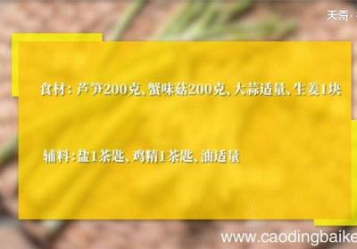步骤1食材:芦笋200克、蟹味菇200克、大蒜适量、生姜1块、盐1茶匙、鸡精1茶匙 。步骤2芦笋洗净去皮,斜切成段 。步骤3蟹味菇放入清水中洗净 。步骤4锅中水沸后,放入芦笋和蟹味菇过水,捞出沥干 。步骤5姜切末 。步骤6蒜切末 。【清炒芦...