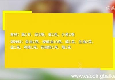 步骤1食材:藕1节、蒜2瓣、姜2克、小葱2根 。调味料:香油2克、辣椒油10克、醋1克、生抽2克、盐1克、鸡精1克、花椒粉1克、糖1克 。步骤2藕放入冷水锅中,大火煮20分钟,取出,切片,摆入盘中 。步骤3蒜切末,姜切末,小葱切葱花 。步骤...