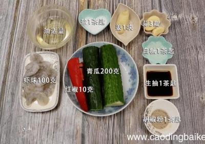 步骤1准备食材:青瓜200克、虾球100克、油适量、盐1茶匙、姜1块、蒜3瓣、白糖1茶匙、生抽1茶匙、胡椒粉1茶匙、红椒10克 。步骤2虾球洗净 。步骤3青瓜洗净切丁 。步骤4红椒切丁 。步骤5姜切片 。步骤6蒜切片 。步骤7首先起锅倒油,...