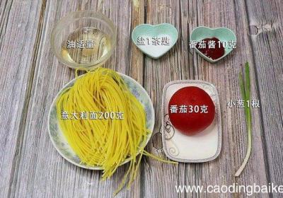 步骤1准备食材:意大利面200克、番茄30克、油适量、盐1茶匙、番茄酱10克、小葱1根 。步骤2意大利面冷水浸泡10分钟 。步骤3番茄用开水烫2分钟,去皮切丁 。步骤4小葱切葱花 。步骤5首先起锅烧热水,水开放入意大利面,煮熟捞出备用 。步...