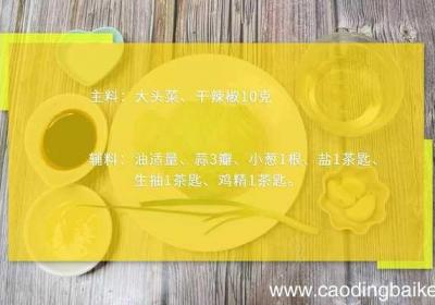 步骤1准备食材:大头菜、干辣椒10克、油适量、蒜3瓣、小葱1根、盐1茶匙、生抽1茶匙、鸡精1茶匙 。步骤2大头菜洗净撕小块 。步骤3干辣椒切段 。步骤4蒜切末 。步骤5小葱切葱花 。步骤6首先起锅烧油,放入、干辣椒、蒜末炒香,再放入大头菜翻...