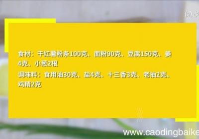 步骤1食材:干红薯粉条100克,面粉90克,豆腐150克,姜4克,小葱2根 。调味料:食用油30克,盐4克,十三香3克,老抽2克,鸡精2克 。步骤2姜切末,小葱切葱花,豆腐切块 。步骤3锅中水沸后,下干红薯粉条,煮4分钟,捞出,冷却后,剁碎...