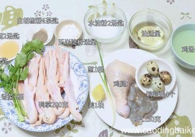 步骤1准备食材:鸭掌200克、鸡腿1个、虾仁30克、鹌鹑蛋4个、葱1根、姜1块、料酒2汤匙、盐1茶匙、玉米淀粉适量、鸡汤1碗、白胡椒粉1茶匙、香菜1根、水淀粉2汤匙、油适量 。步骤2葱切段 。步骤3姜切片 。步骤4香菜切段 。步骤5鸭掌剁去...