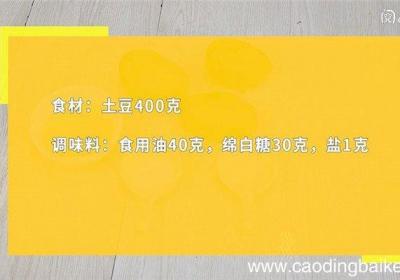 步骤1食材:土豆400克 。调味料:食用油40克,绵白糖30克,盐1克 。步骤2土豆去皮,切小块,放入清水中,浸泡20分钟,再清洗一次,捞出 。步骤3锅中油温6成热时,倒入土豆,炸至金黄,捞出 。步骤4锅中留少许底油,转小火,倒入绵白糖,炒...