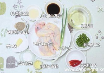 步骤1准备食材:鸡肉200克、藤椒30克、姜1块、葱1根、盐2茶匙、胡椒粉1茶匙、小米椒3个、鸡精1茶匙、料酒1汤匙、生抽1汤匙、油适量 。步骤2姜切片 。步骤3小米椒切圈 。步骤4葱打结 。步骤5鸡肉剁成块 。步骤6大火烧开后加入料酒,改...