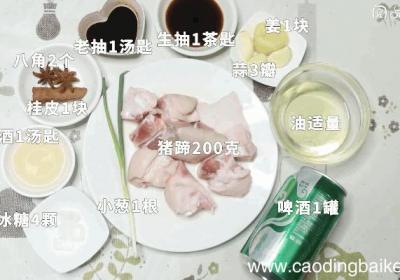 步骤1准备食材:猪蹄200克、啤酒1罐、小葱1根、冰糖4颗、料酒1汤匙、老抽1汤匙、生抽1茶匙、八角2个、桂皮1块、姜1块、蒜3瓣、油适量 。步骤2姜切片 。步骤3蒜切片 。步骤4葱切葱花 。步骤5锅内倒水烧开,放入猪蹄煮约1分钟,除去血水...