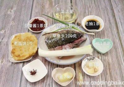 步骤1准备食材:草鱼头200克、老面饼1个、草鱼头200克、老面饼1个、豆瓣酱1茶匙、老抽1茶匙、八角5克、大葱1段、姜1块、蒜3瓣、小葱1根、盐1茶匙、油适量 。步骤2鱼头洗净打花刀 。步骤3大葱切片 。步骤4小葱切葱花 。步骤5姜切片...