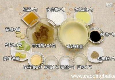 步骤1准备食材:牛蹄黄300克、葱段10克、蒜瓣3瓣、姜块适量、水淀粉3勺、精盐1勺、胡椒粉1勺、味精1勺、绍酒2勺、花椒油1勺、酱油2勺、白糖1勺、色拉油2勺、鸡汤适量 。步骤2锅内放入适量清水、牛蹄黄、葱段、姜片,煮至八成熟 。步骤3捞...