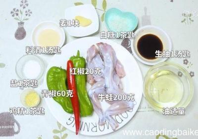 步骤1准备食材:牛蛙200克、青椒60克、姜1块、料酒1汤匙、红椒20克、生抽1汤匙、白糖1茶匙、盐1茶匙、鸡精1茶匙、油适量 。步骤2姜切片 。步骤3青椒切块 。步骤4红椒切块 。步骤5牛蛙剁成块 。步骤6【青椒牛蛙怎么做青椒牛蛙的做法】...