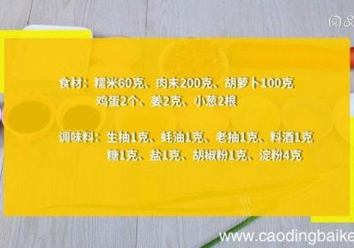 步骤1食材:糯米60克、肉末200克、胡萝卜100克、鸡蛋2个、姜2克、小葱2根 。调味料:生抽1克、蚝油1克、老抽1克、料酒1克、糖1克、盐1克、胡椒粉1克、淀粉4克 。步骤2糯米用清水浸泡24小时,捞出 。步骤3【胡萝卜糯米丸子的做法...