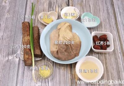 步骤1准备食材:猪肚200克、山药100克、红枣5颗、姜1块、蒜3瓣、小葱1根、盐1茶匙、料酒1茶匙、鸡精1茶匙 。步骤2猪肚洗净切条 。步骤3山药去皮洗净切块 。步骤4姜切片 。步骤5红枣去核切片 。步骤6小葱切葱花 。步骤7锅中加热水放...