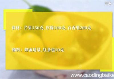 步骤1所需食材:芒果1个,柠檬1个,百香果2个、蜂蜜适量、红茶10克 。步骤2红茶包用开水泡好 。步骤3百香果对半切开 。步骤4挖出果肉,放入泡好的茶里 。步骤5柠檬切块 。步骤6芒果对半切开,划十字切块 。步骤7放入红茶里,加入适量蜂蜜,...