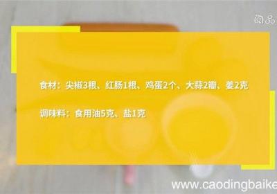 步骤1食材:尖椒3根、红肠1根、鸡蛋2个、大蒜2瓣、姜2克、食用油5克、盐1克 。步骤2尖椒切斜片 。步骤3红肠切片 。步骤4大蒜切片 。步骤5姜切片 。步骤6鸡蛋打散,拌匀成蛋液 。步骤7炒锅中油温5成热时,倒入蛋液炒散,盛出备用 。步骤...