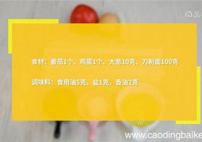 步骤1食材:番茄1个、鸡蛋1个、大葱10克、刀削面100克、食用油5克、盐1克、香油2克 。步骤2番茄切块 。步骤3大葱切片 。步骤4鸡蛋打散 。步骤5拌匀成蛋液 。步骤6炒锅中油温5成热时,放入大葱片爆香,放入番茄炒出汁,加入适量开水煮沸...