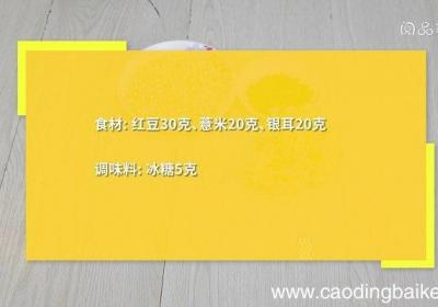 步骤1食材:红豆30克、薏米20克、银耳20克 。调味料:冰糖5克 。步骤2红豆、薏米用水浸泡2小时 。步骤3银耳泡发,撕成小朵 。步骤4锅中倒入适量清水,放入红豆、薏米、银耳,大火煮沸转小火煮1小时,放入冰糖煮至融化即可 。【红豆薏米银耳...