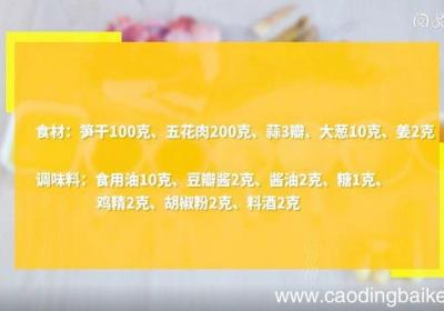 步骤1食材:笋干100克,五花肉200克,蒜3瓣,大葱10克,姜2克 。调味料:食用油10克,豆瓣酱2克,酱油2克,糖1克,鸡精2克,胡椒粉2克,料酒2克 。步骤2笋干用清水浸泡30分钟,切片 。步骤3五花肉切片,蒜对半切开 。步骤4大葱切...