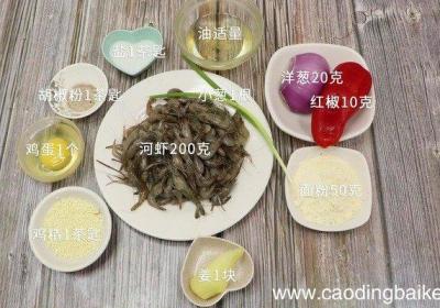 步骤1准备食材:河虾200克、油适量、盐1茶匙、面粉50克、胡椒粉1茶匙、鸡蛋1个、红椒10克、洋葱20克、鸡精1茶匙、料酒1茶匙、小葱1根、姜1块 。步骤2河虾洗净去虾须 。步骤3鸡蛋搅散备用 。步骤4小葱切葱花 。步骤5姜切末 。步骤6...