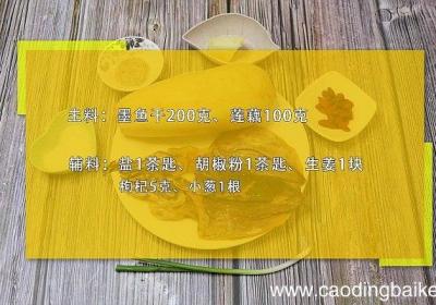 步骤1准备食材:墨鱼干200克、莲藕100克、盐1茶匙、胡椒粉1茶匙、生姜1块、枸杞5克、小葱1根 。步骤2墨鱼干泡发,撕掉黑膜切成条 。步骤3莲藕去皮切小块 。步骤4生姜切片 。步骤5枸杞浸泡5分钟 。步骤6小葱切葱花 。步骤7首先砂锅内...