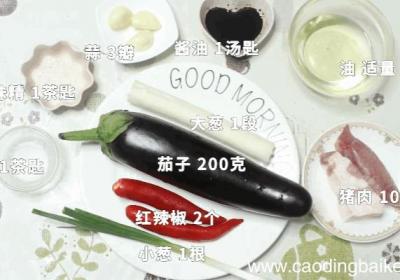 步骤1准备食材:茄子200克、红辣椒2个、猪肉100克、大葱1段、蒜3瓣、酱油1汤匙、味精1茶匙、小葱1根、盐1茶匙、油适量 。步骤2红辣椒切条 。步骤3大葱切片 。步骤4蒜切末 。步骤5猪肉剁成末 。步骤6茄子切成2.5厘米小段 。步骤7...