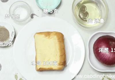 步骤1准备食材:洋葱150克、吐司100克、盐5克、糖5克、胡椒粉5克、油40克、油适量 。步骤2洋葱切去根、蒂后,剥皮再切丝 。步骤3吐司放入烤箱烤焦 。步骤4将烤好的吐司切丁 。步骤5炒锅放油,油热放入洋葱丝炒香,炒至洋葱丝呈焦黄 。步...