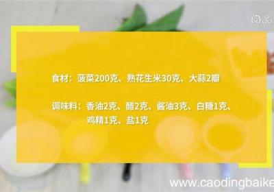 步骤1食材:菠菜200克、熟花生米30克、大蒜2瓣、香油2克、醋2克、酱油3克、白糖1克、鸡精1克、盐1克 。步骤2大蒜切末 。步骤3【花生拌波菜的做法 花生拌波菜怎么做】锅中放水煮沸,放入菠菜焯烫1分钟,捞出 。步骤4大碗中放入菠菜、熟花...