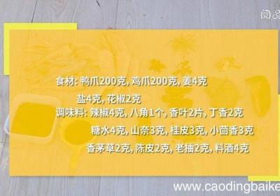 步骤1食材:鸭爪200克,鸡爪200克,姜4克调味料:干辣椒4克,八角1个,香叶2片,糖水4克,山奈3克,桂皮3克,小茴香3克,丁香2克,香茅草2克,陈皮2克,老抽2克,料酒4克,盐4克,花椒2克步骤2锅中倒入清水,加鸭爪、鸡爪、料酒,大火...
