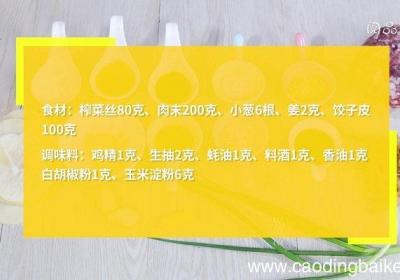 步骤1食材:榨菜丝80克、肉末200克、小葱6根、姜2克、饺子皮100克 。调味料:鸡精1克、生抽2克、蚝油1克、料酒1克、香油1克、白胡椒粉1克、玉米淀粉6克 。步骤2榨菜丝用冷水浸泡10分钟,捞出沥干,切末 。步骤3小葱切末,姜切末 。...