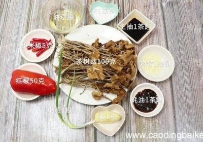 步骤1准备食材:茶树菇100克、红椒50克、油适量、盐1茶匙、生抽1茶匙、鸡精1茶匙、蚝油1茶匙、姜1块、小米椒5克、小葱1根 。步骤2茶树菇用温水泡开,再剪成段 。步骤3红椒切丝 。步骤4小葱切葱花 。步骤5姜切片 。步骤6小米椒切圈 。...